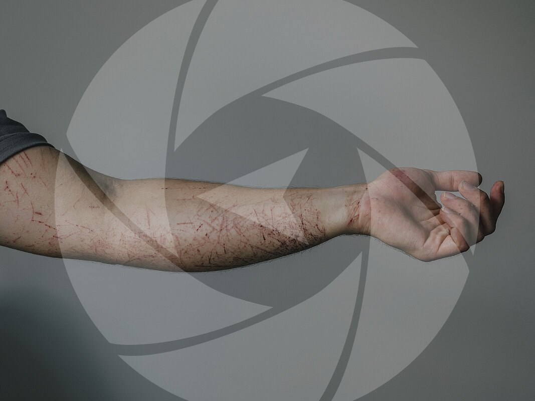 Der Arm von Ivan ist extrem aufgeschürft durch zahlreiche Dornenbüsche im Grenzgebiet, die es zu überwinden galt. Er ist aus der Ukraine nach Düsseldorf geflüchtet.Düsseldorf, 25.08.2024.