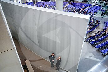 Christian Lindner (FDP), Bundesminister der Finanzen, und Bundeskanzler Olaf Scholz (r, SPD) unterhalten sich nach der Regierungserklärung von Kanzler Scholz hinter dem Plenum.