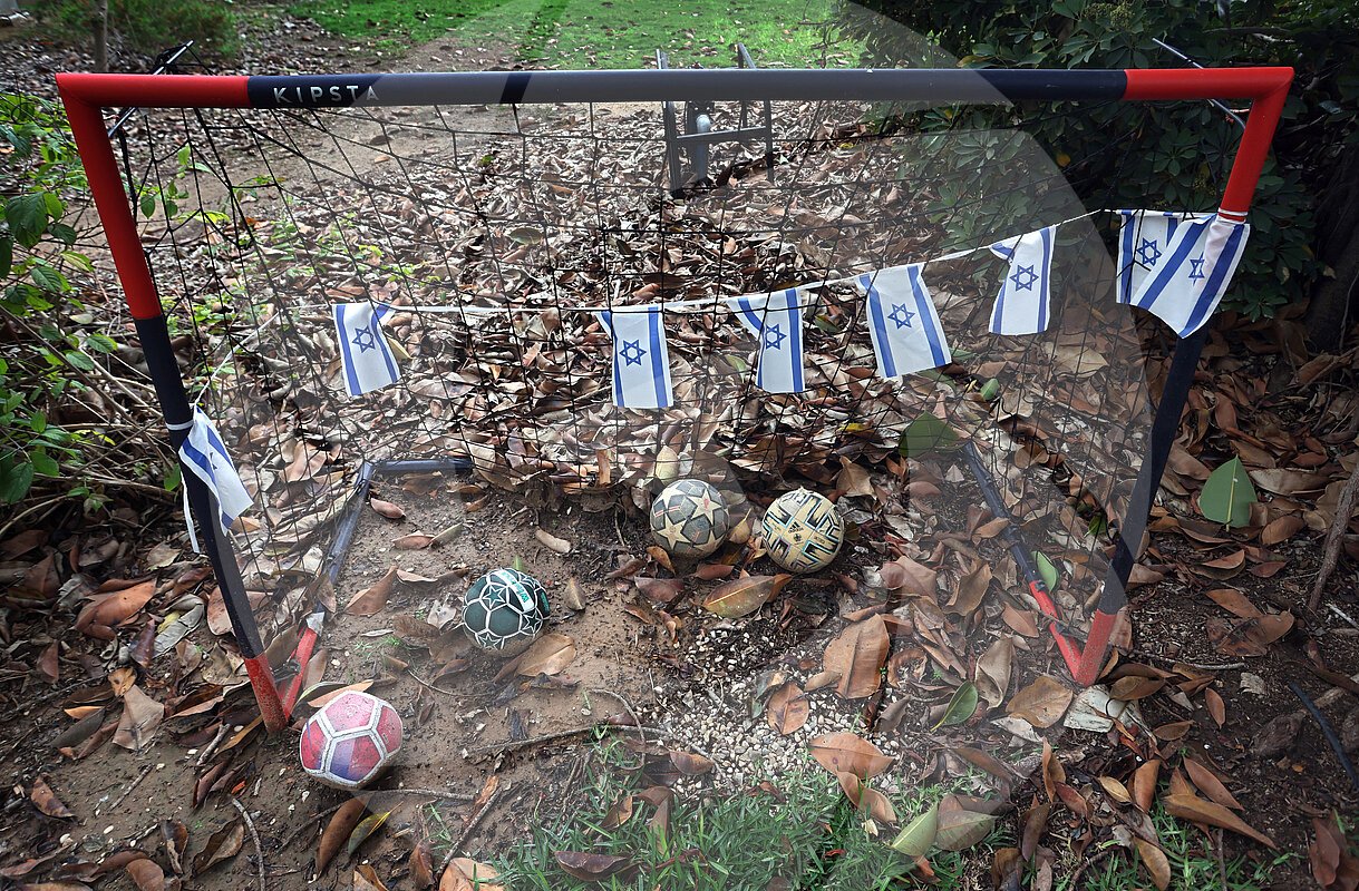 Im Garten eines zerstörten Hauses im Kibbuz Nir Oz steht ein mit israelischen Flaggen geschmücktes Kinderfußballtor. Die Zeit scheint stehengeblieben zu sein im Kibbuz Nir Oz.... MEHR