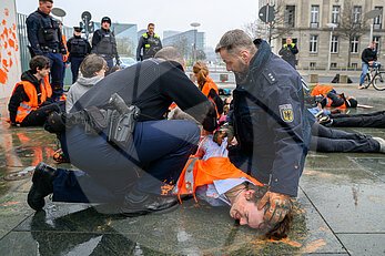 Polizist kniet bei Fesselung einer Aktivistin der Letzten Generation mit Handschellen auf deren Gesicht. Nach Farbattacke auf das Bundeskanzleramt.