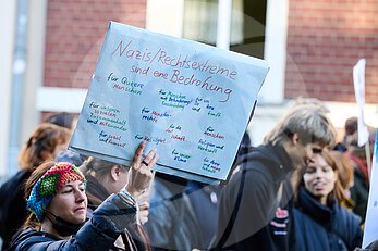 „Nazis/Rechtsextreme sind eine Bedrohung: für quere Menschen, für Menschen mit Behinderung, für Menschen, Religionen und Herkunft,..“ steht auf einem Plakat einer Demonstrantin,... MEHR